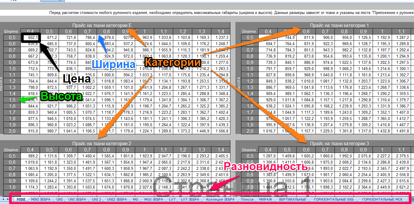 Разновидность, Категория, Высота, Ширина, Цена и так построчно по всем страницам экселя.