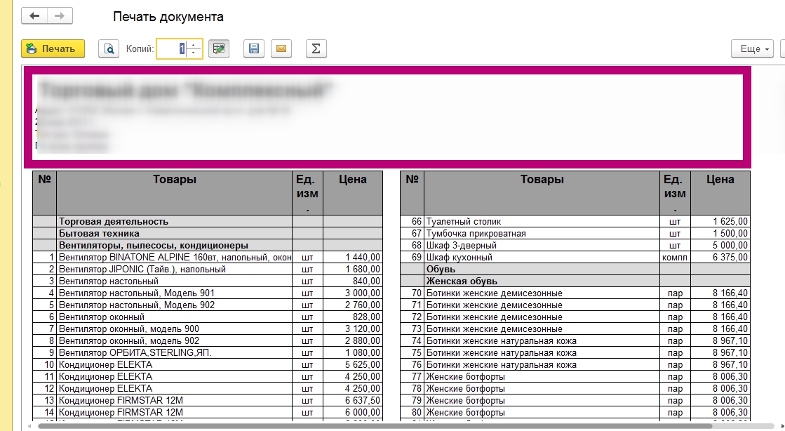 Печать прайс-листа в 2 колонки с возможностью вставить шапку УТ 11.4
