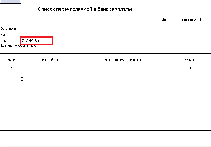 Печатная форма Ведомость в банк с указанием Статьи финансирования