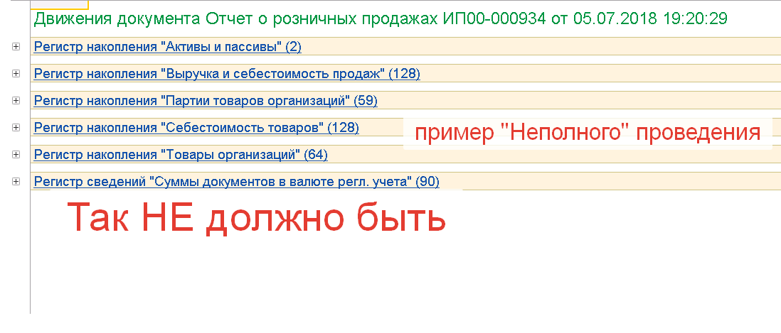 В УТ11.4 некоторые отчёты о розничных продажах проводятся не полностью. Вместо проведения по 12-ти регистрам, происходит проведение по 6-ти регистрам.