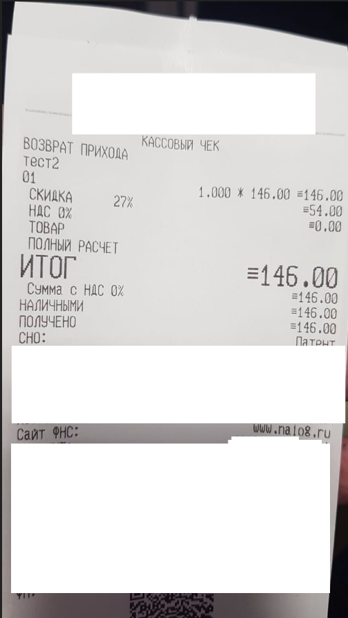 Допустим мы производим продажу товара за 200 рублей. Даем на него скидку 27%, т.е. 54 рубля. Итоговая сумма 146 рублей получается. Логично, что мы рассчитываем увидить в чеке что-то такое: