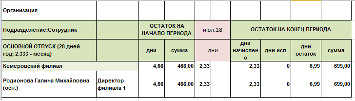 Соответственно, если отчет будет за июль 2018 и сотрудник не был в отпуске, то мы увидим результат как на рис.15.