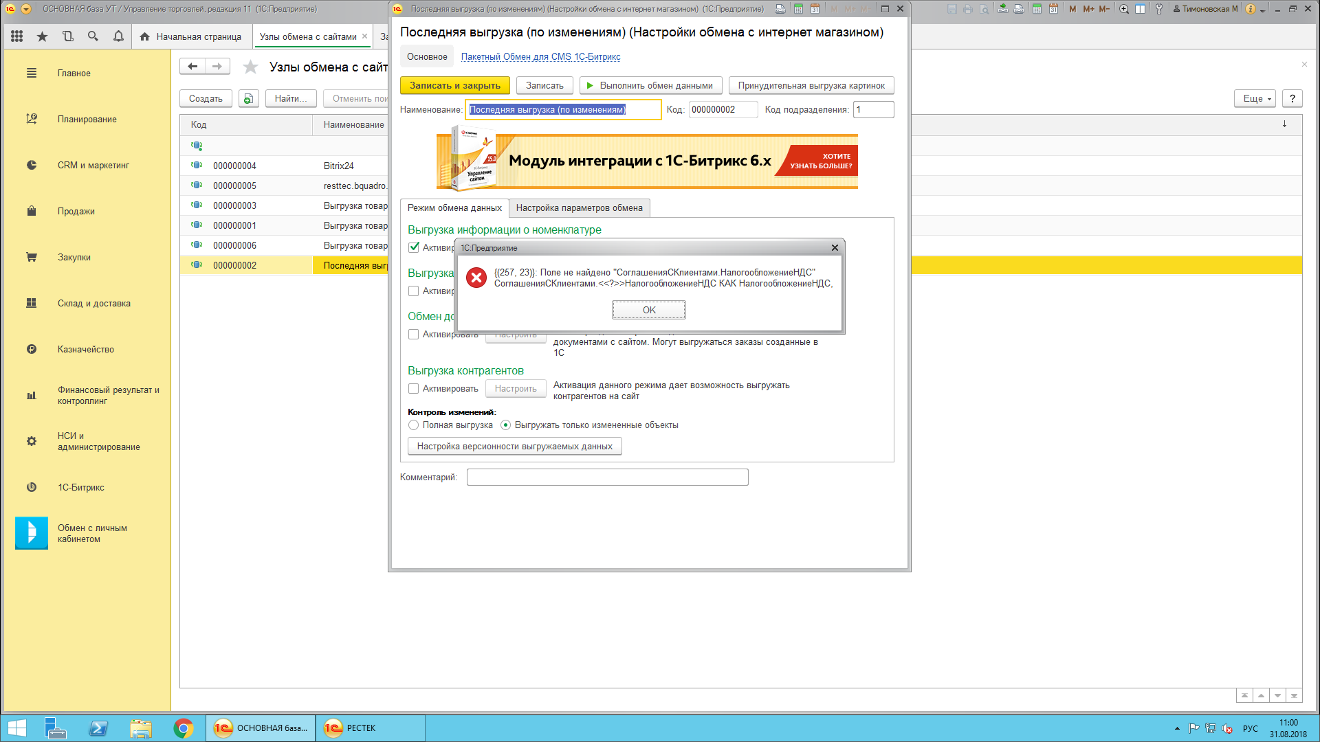 Исправить ошибку после перехода на УТ 11.4 (ошибка обмен битрикс)