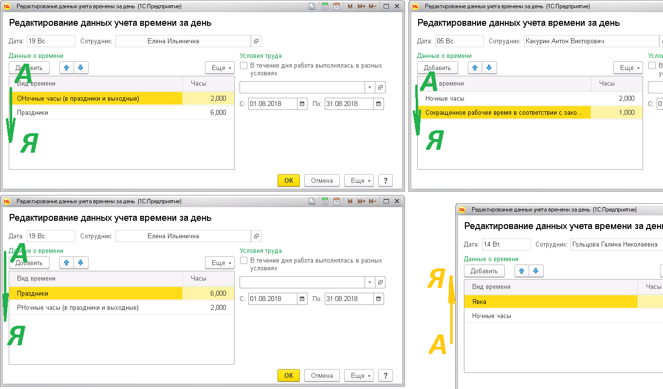 В документе табель при стандартном заполнении если провалится в день, где было учтено больше одного вида времени, то мы увидим что сортировка работает по алфавиту (пробовал переименовывать виды времени). Но при этом Явка и Ночные - идут в последовательности правильной - против алфавита..
