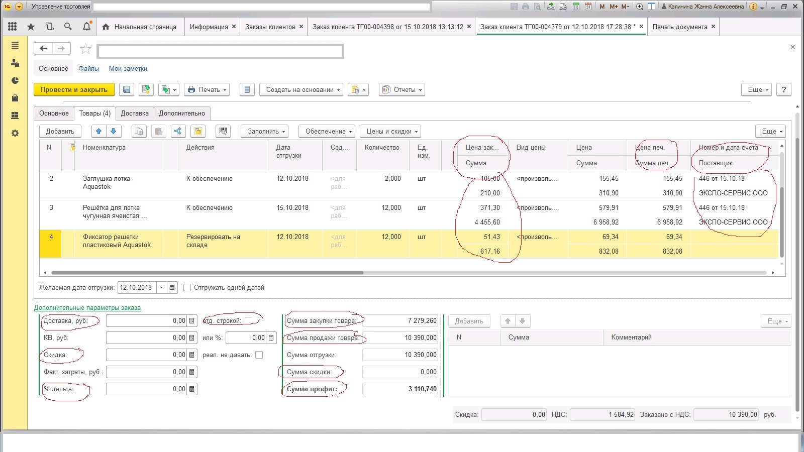 Требуется доработка 1с 8.3 Управление торговлей, редакция 11 (11.4.10.57) Необходимо добавить дополнительные параметры заказа. Графу Доставка, скидка, % дельты, сумма закупки товара, сумма продажи товара, сумма профит. Согласно скриншоту