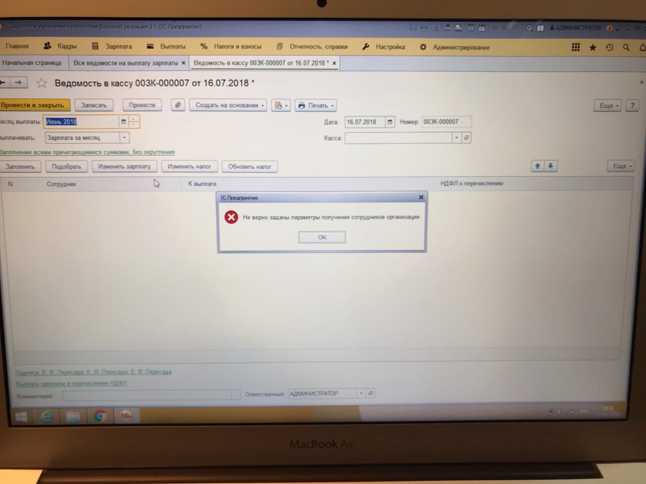 ЗУП 3.1 ошибка при заполнении ведомости на выплату заработной платы