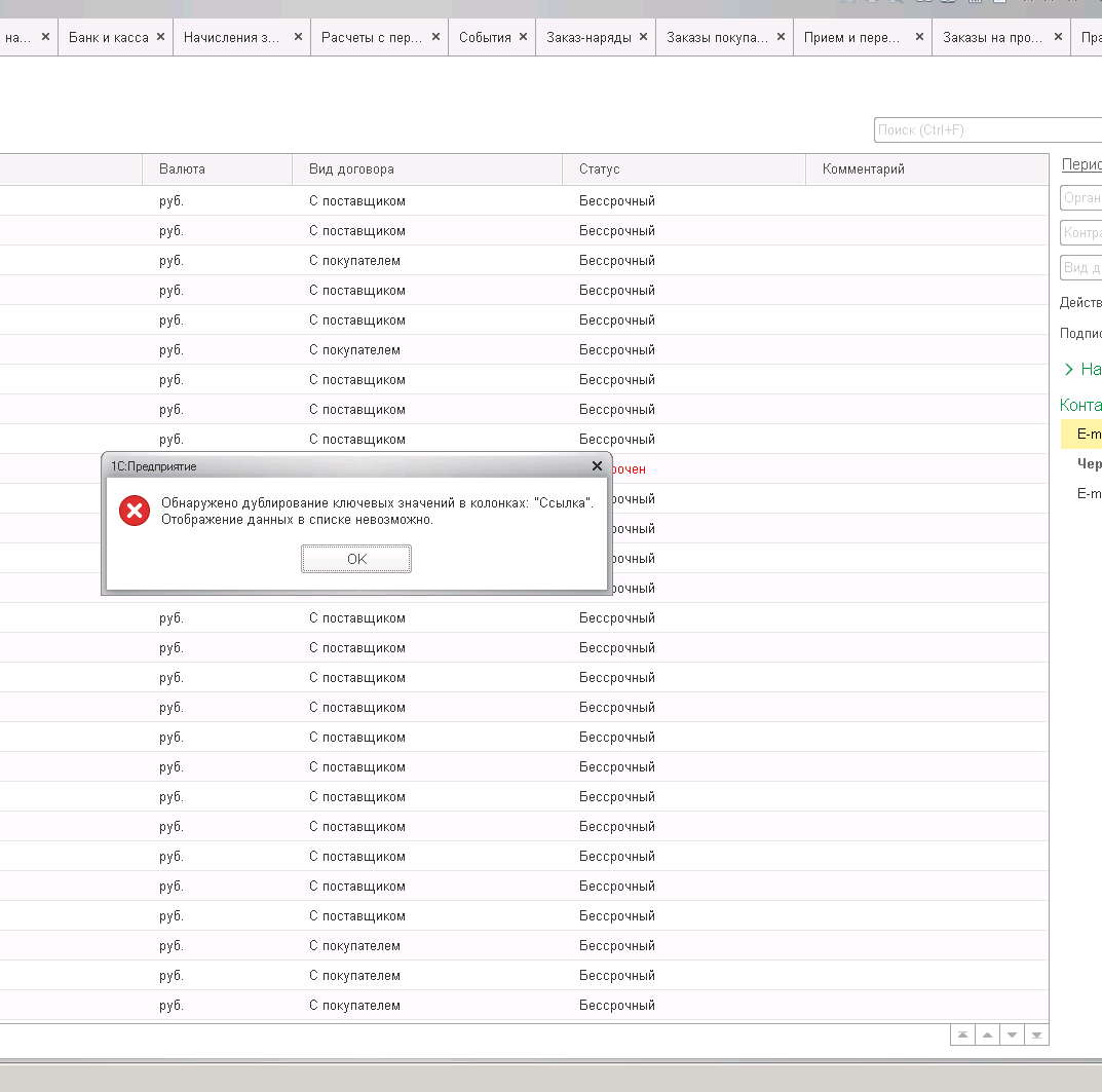 После внепланового отключения электропитания во время резервного копирования базы данных в списке договоров с поставщиками стала выскакивать ошибка: