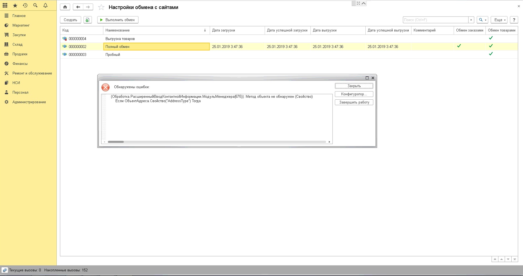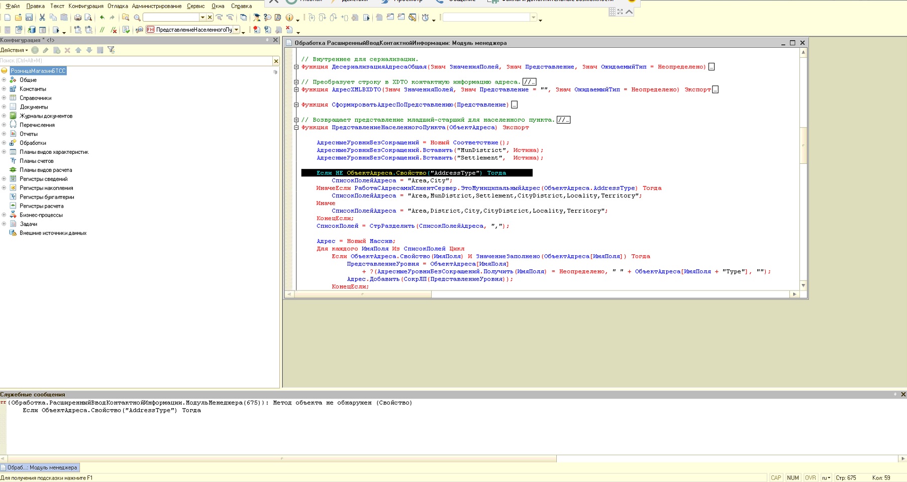 8.3.12.1714, конфигурация: Розница, редакция 2.2 (2.2.11.16) перестал работать обмен с сайтом. Выдает ошибку следующего содержания "{Обработка.РасширенныйВводКонтактнойИнформации.МодульМенеджера(675)}: Метод объекта не обнаружен (Свойство)