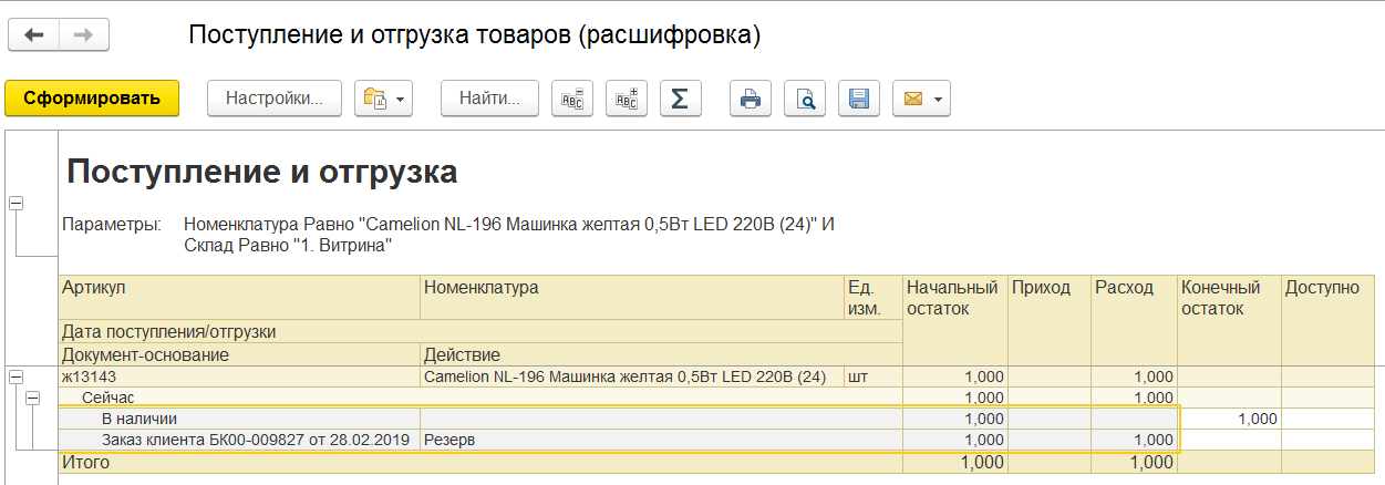 Отчет Остатки и доступность товаров с расшифровкой резервов