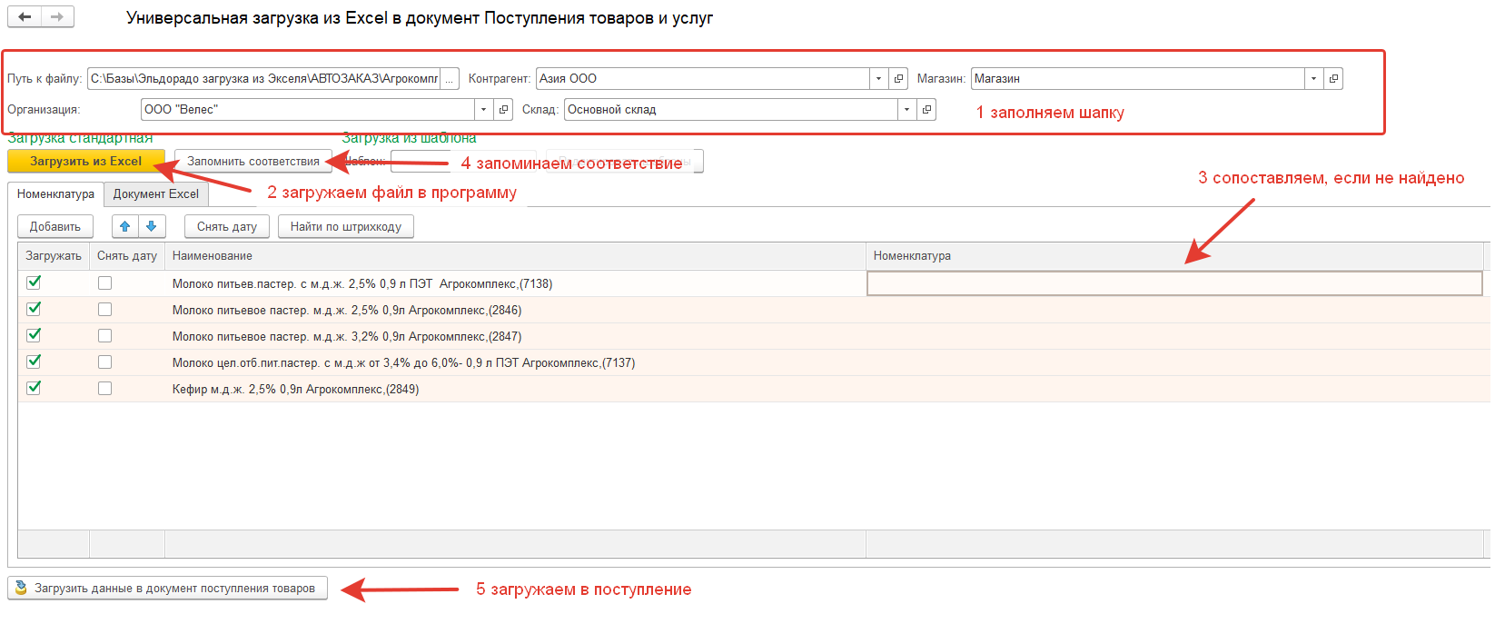 Обработка подгружает в свою табличную часть информацию из Файла, после чего в табличной части происходит сопоставление номенклатуры. После сопоставления происходит заполнение документа Поступление товаров.