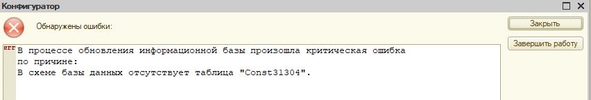При обновлении произошла ошибка: "В процессе обновления информационной бащы произошла ошибка". После при попытке зайти в пользовательский режим ошибка "Ошибка SDBL В схеме базы данных нет таблицы с именем Const30026". При ТИИ тоже ошибка что не хватает таблицы. chdbfl.exe не помогает.