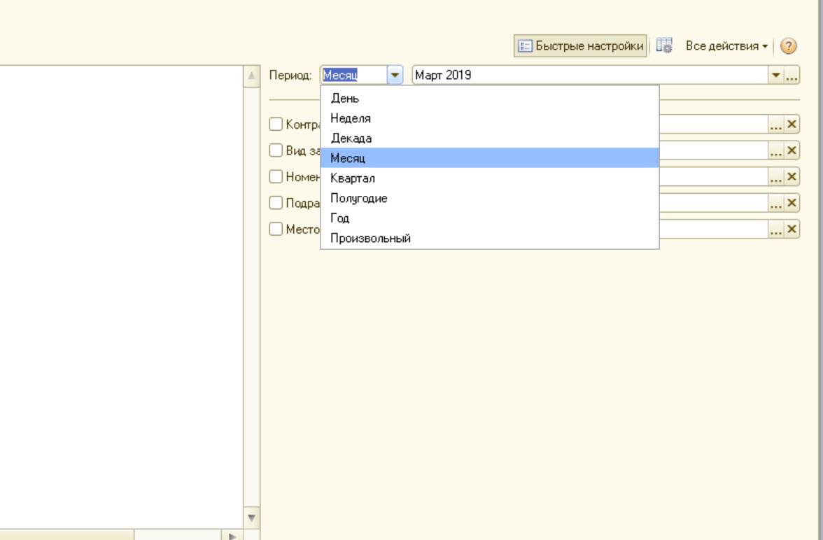 1. Необходимо добавить выбор периода построения отчета - как в прилагаемом скрине, чтобы пользователь мог выбрать различные варианты - день, месяц, квартал, год, произвольный.