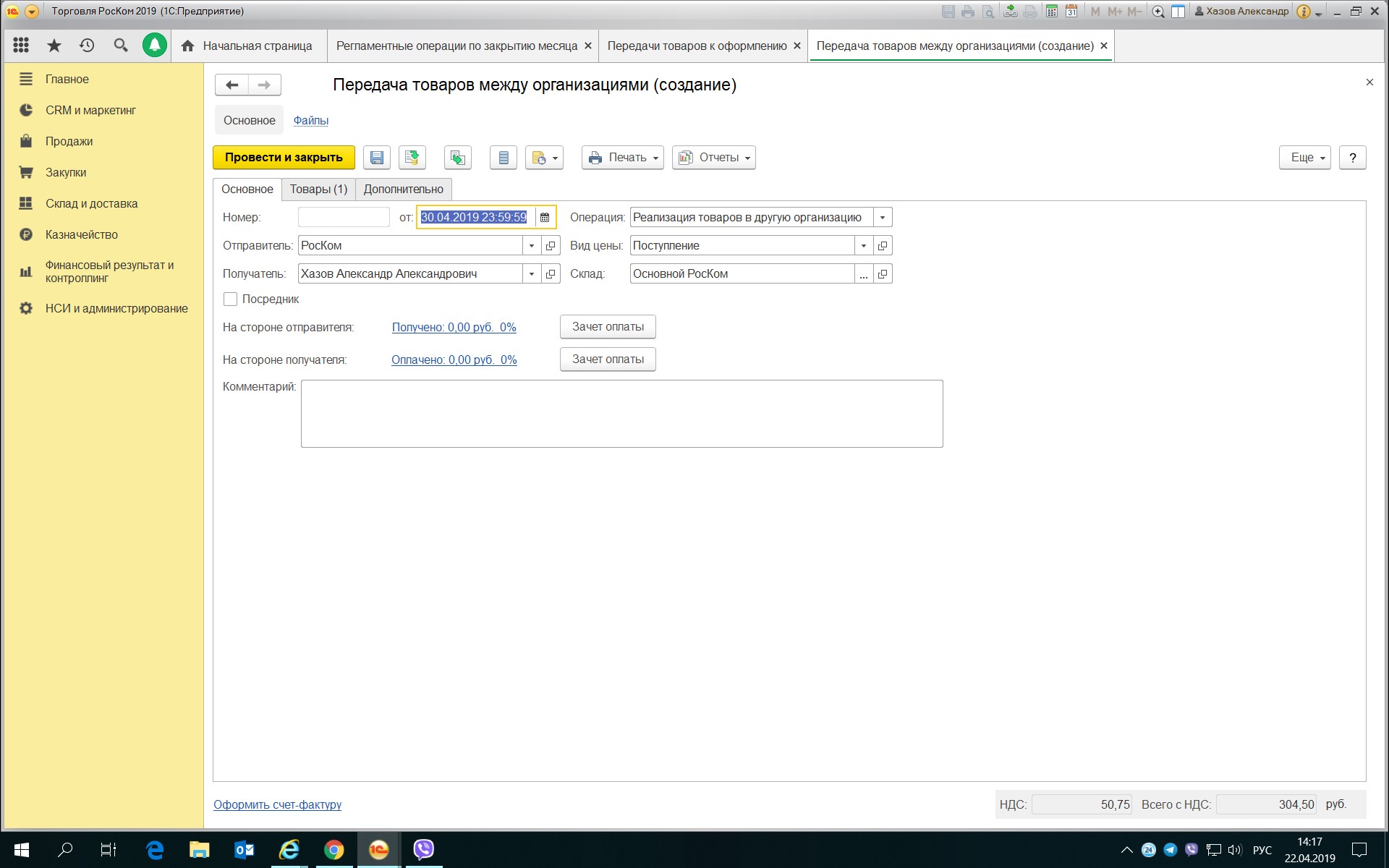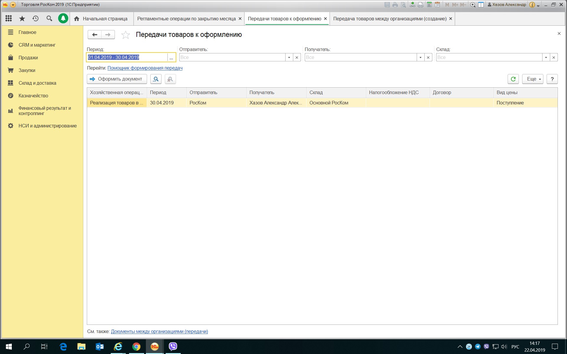 По кнопке Оформить вручную запускается обработка - передачи товаров к оформлению, там по кнопке оформить документ все прекрасно заполняется. Проводим созданный документ передача товаров между организациями, оформляем счет фактуру и возвращаемся к исполнению регламентных операций по закрытию месяца.
