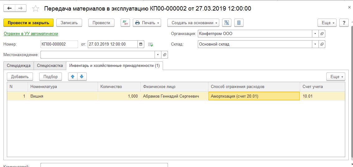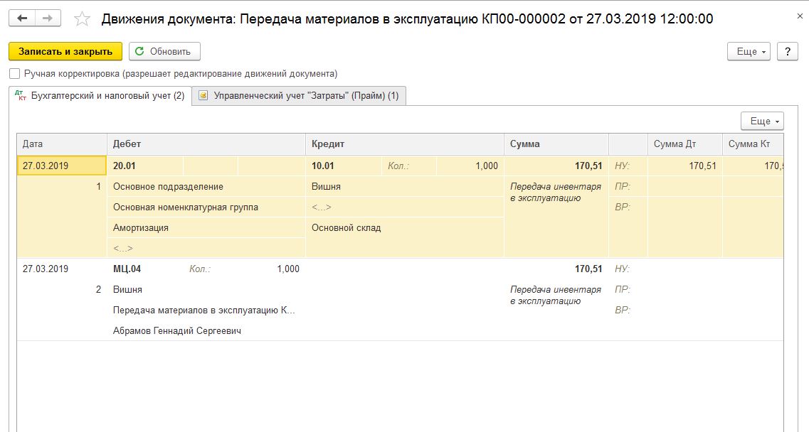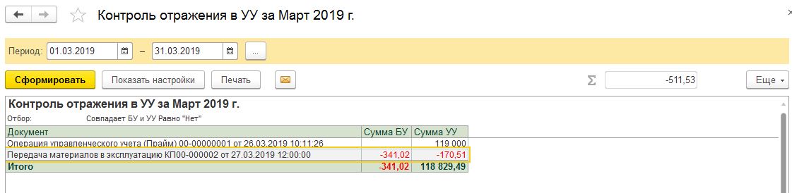 3. Документ "Передача материалов в эксплуатацию" (материалы на вкладке "инвентарь") некорректно отражается в отчете "Контроль отражения в УУ" (смотрите скриншоты). Для этих документов в отчете надо учитывать только проводки по счетам МЦ.хх