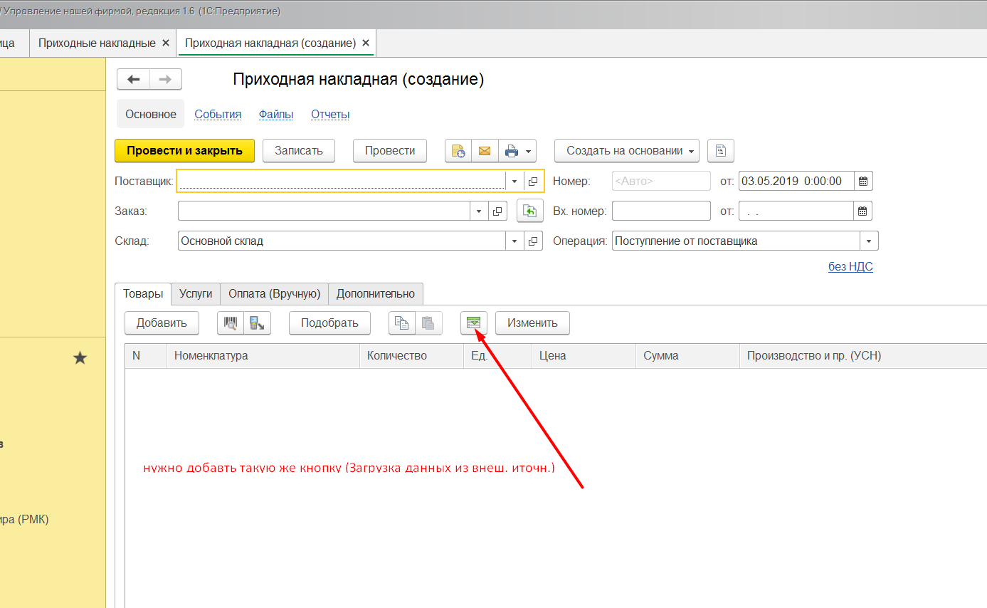 Необходимо добавить кнопку «загрузка данных из внешнего источника», как в Приходной накладной: http://prntscr.com/nk2c6u
