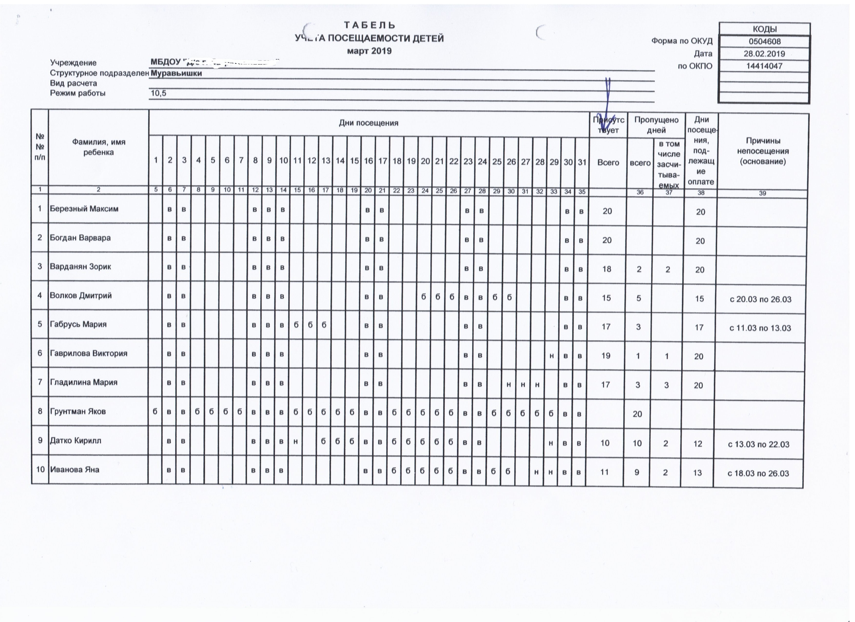 2) Для документа "Табель учета посещаемости детей" также приделать внешнюю печатную форму, образец ее во вложении. Т.е. в ней добавить только 1 графу (отмечена стрелкой), желательно чтобы она вычислялась сама, но если это сложно, пусть она будет заполнена "днями посещений").