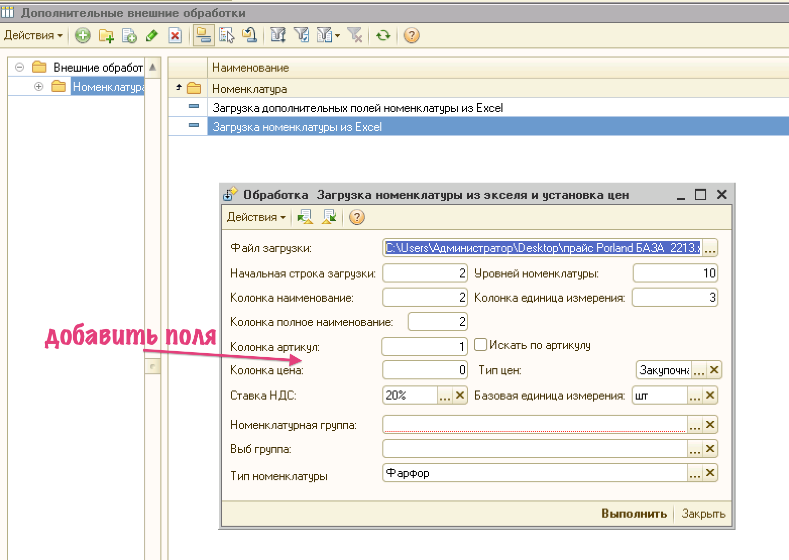 Нужно дописать обработку, чтобы можно было из экселя грузить также следующие поля (добавить их после поля Колонка Артикул):