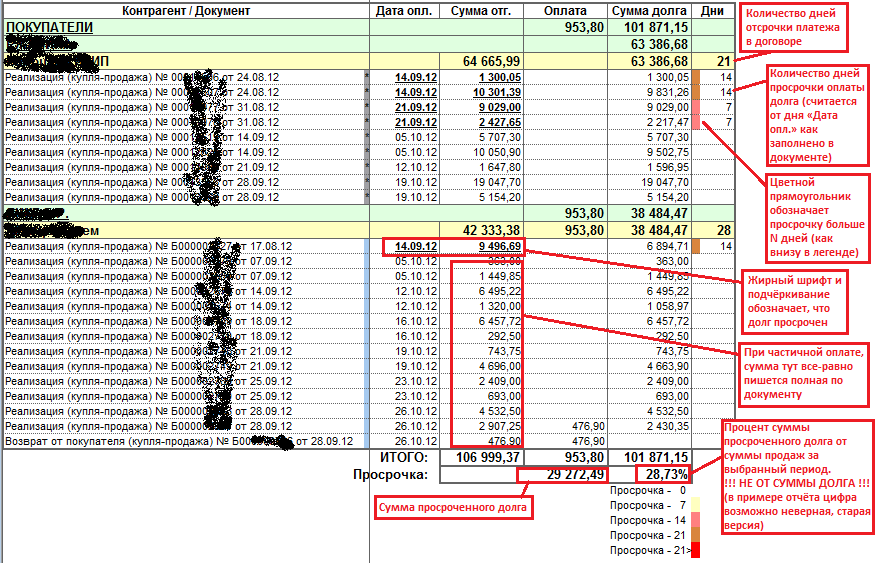 1. Добавить возможность формировать отчет без колонки "Оплата" и отображать тогда только те документы, по которым остался долг на конец периода. Но процент просрочки считать от суммы продаж за указанный период.