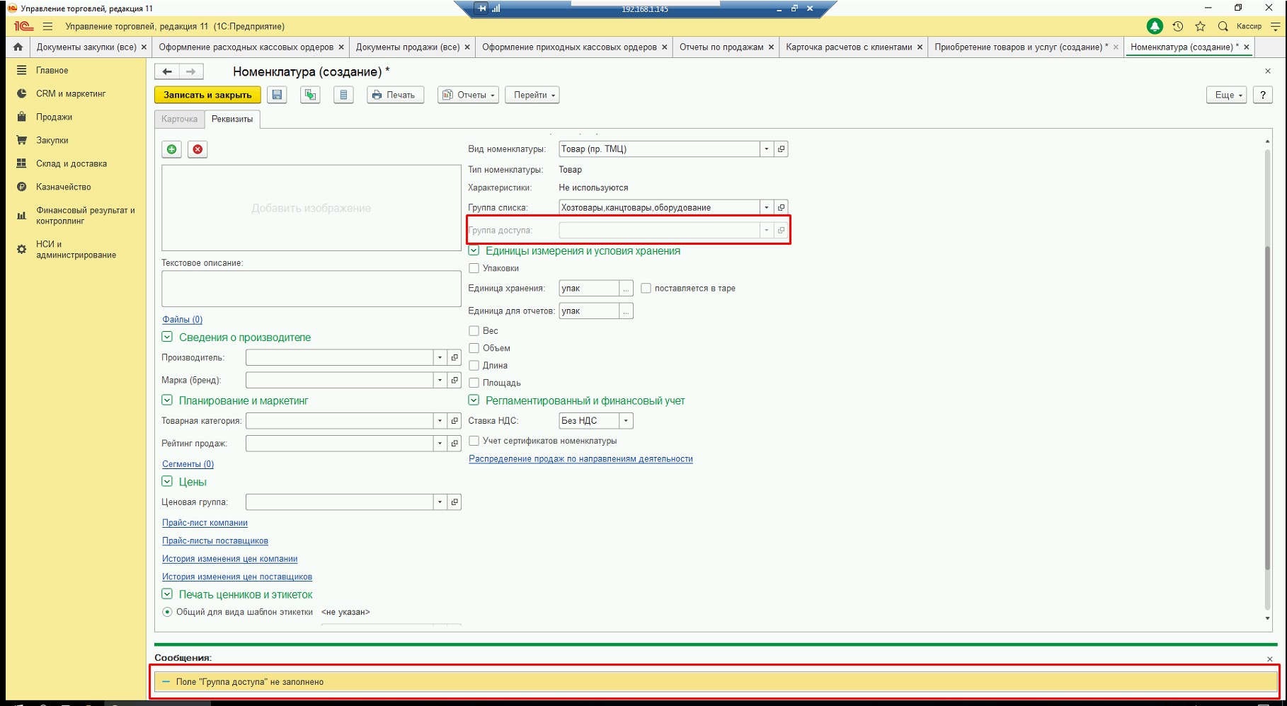 Создание новой позиции номенклатуры копированием, поле "группа доступа" не активно, оператор не может провести сохраненную новую единицу номенклатуры.