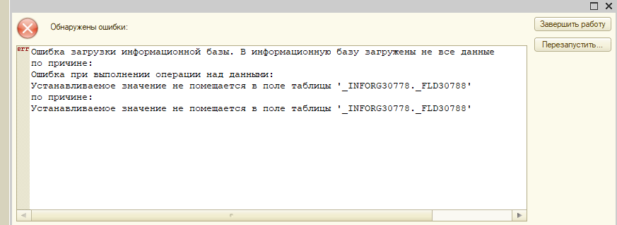 Устанавливаемое значение не помещается в поле таблицы '_INFORG30778._FLD30788'