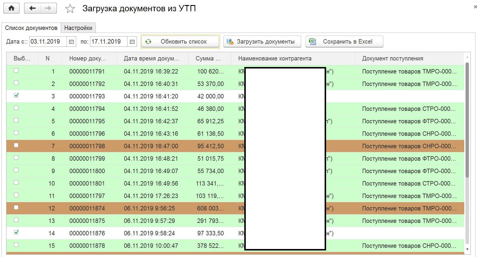 - зеленым цветом подсвечиваем те документы которые уже загружены (проверяем по строкам и реквизитам), отображаем документ который был создан в Рознице, галочка для загрузки не установлена;