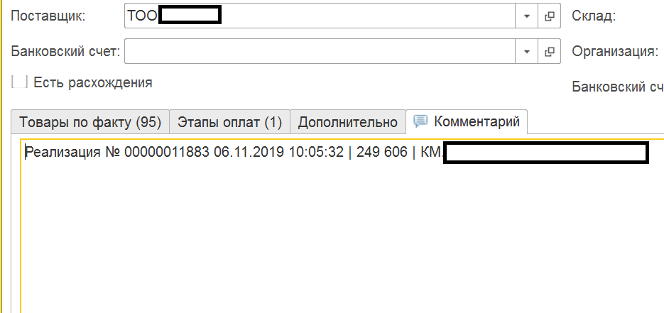 Оператор может как угодно поставить галочки и нажать кнопку создания документов. В комментарий документа пишем реквизиты документа, сумму и наименование контрагента из файла.