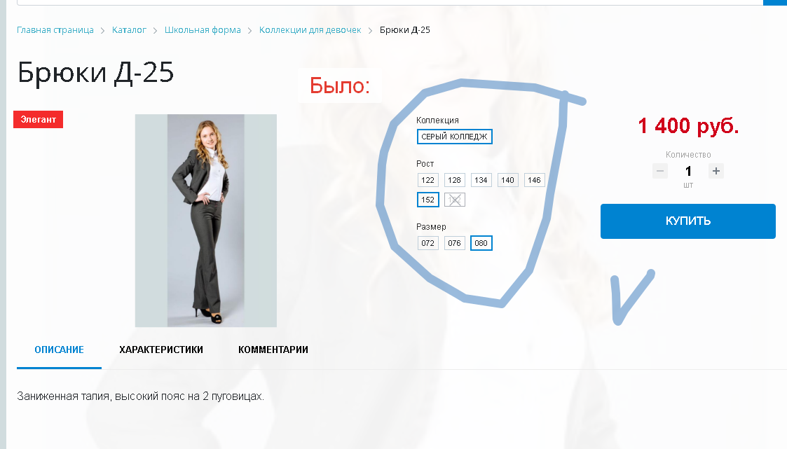 После настройки штатной выгрузки (см Скриншот1) из 1С:Далион момент "выбираешь на сайте размер одежды" испортился. См скриншот2.