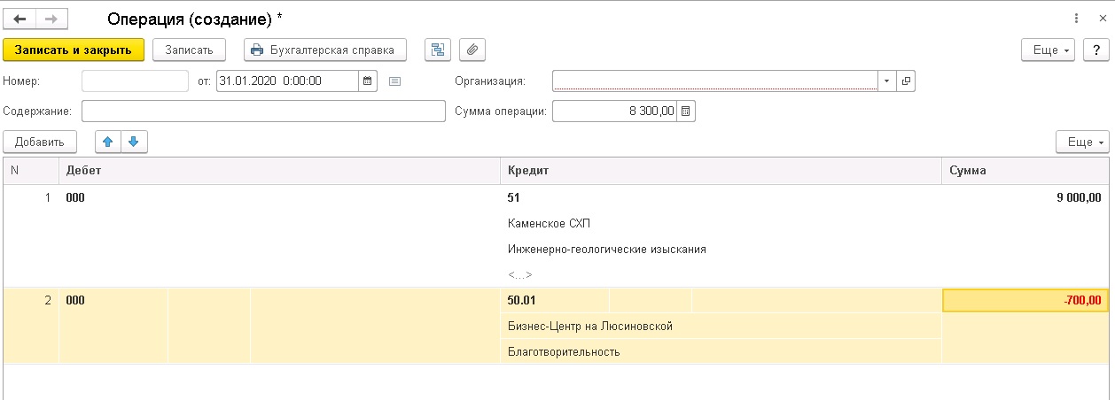 Счета в операциях используется из загрузки (51 или 50.01) и 000.