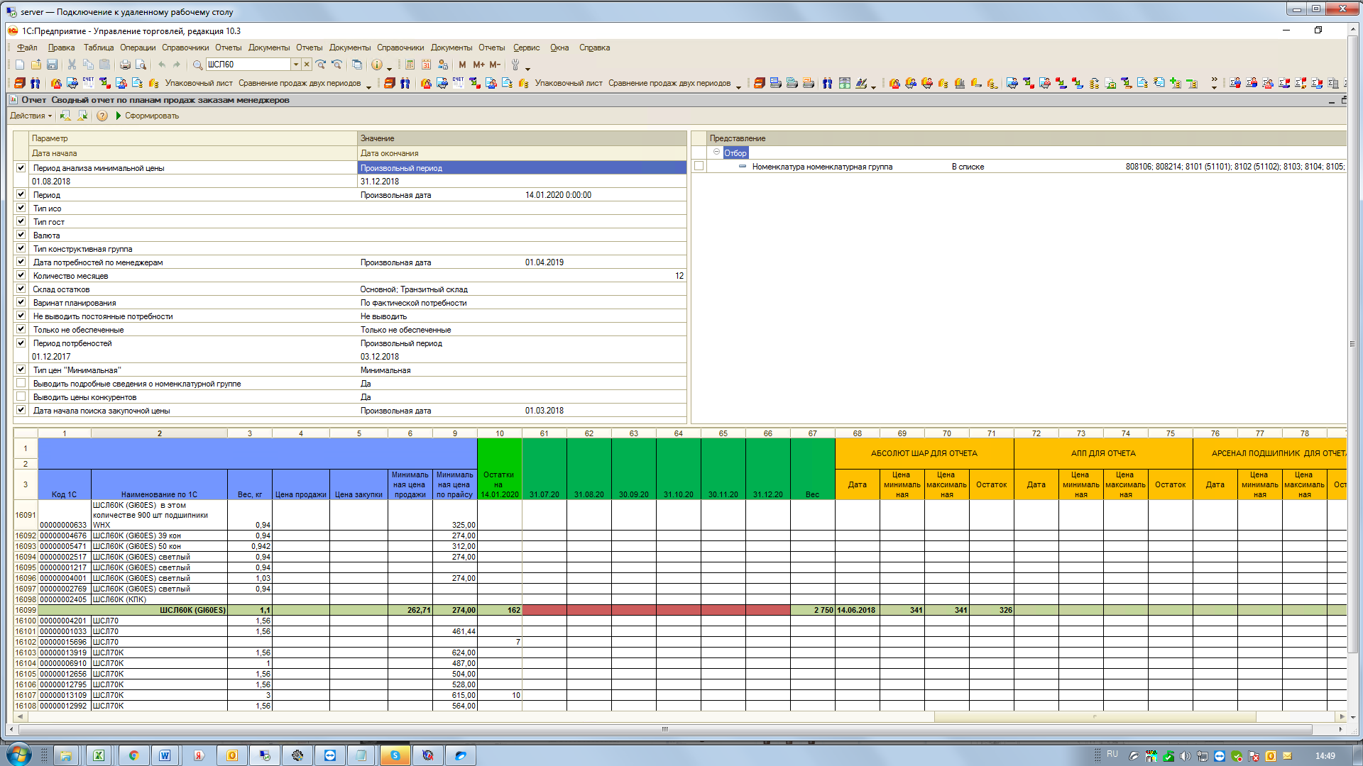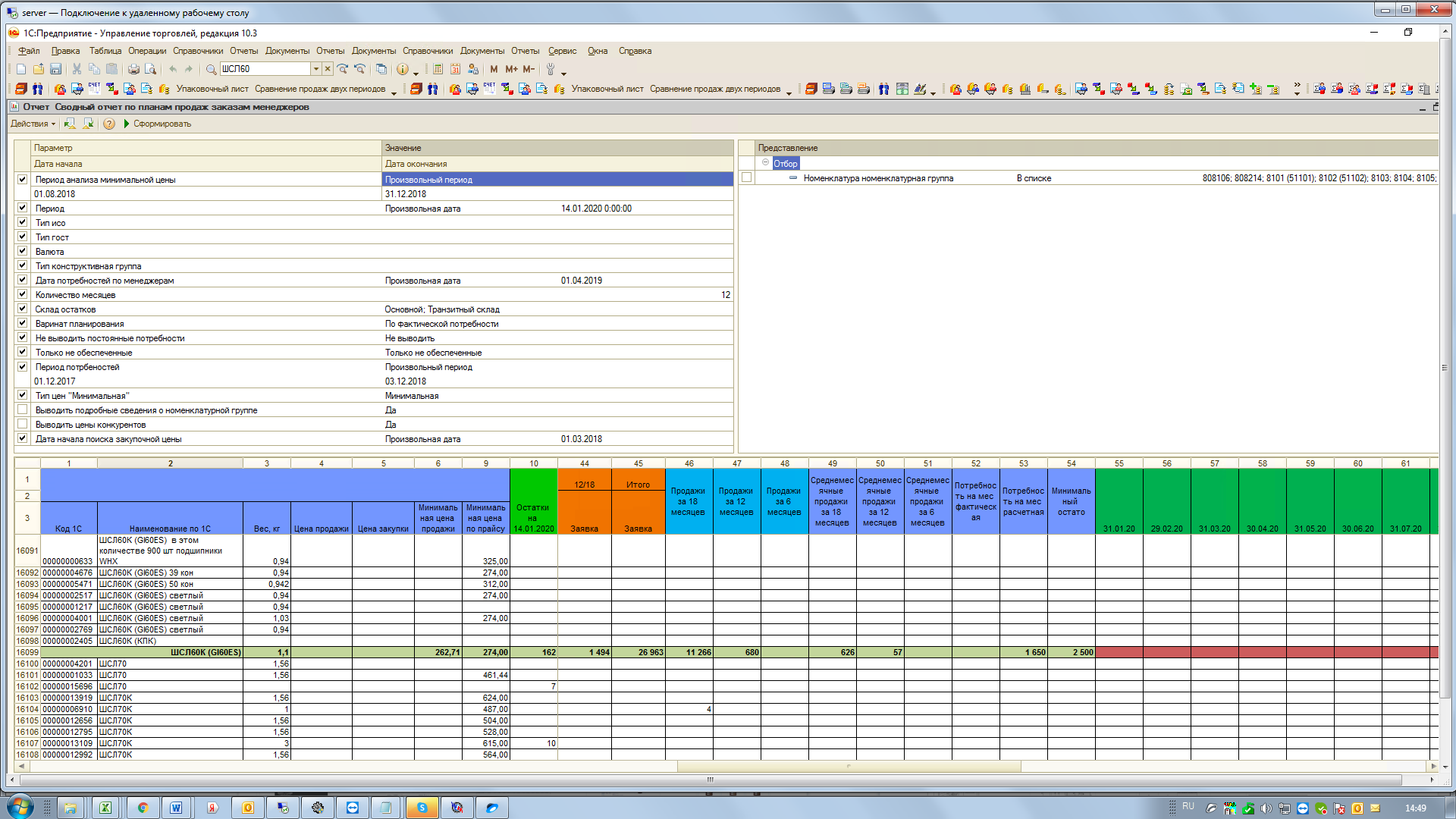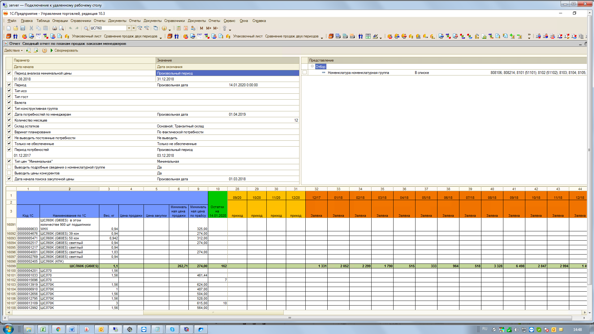 4) Формирования плана закупок (по номенклатурно) исходя из текущего запаса, кол-во по продажам (по заказам),планируемого поступления