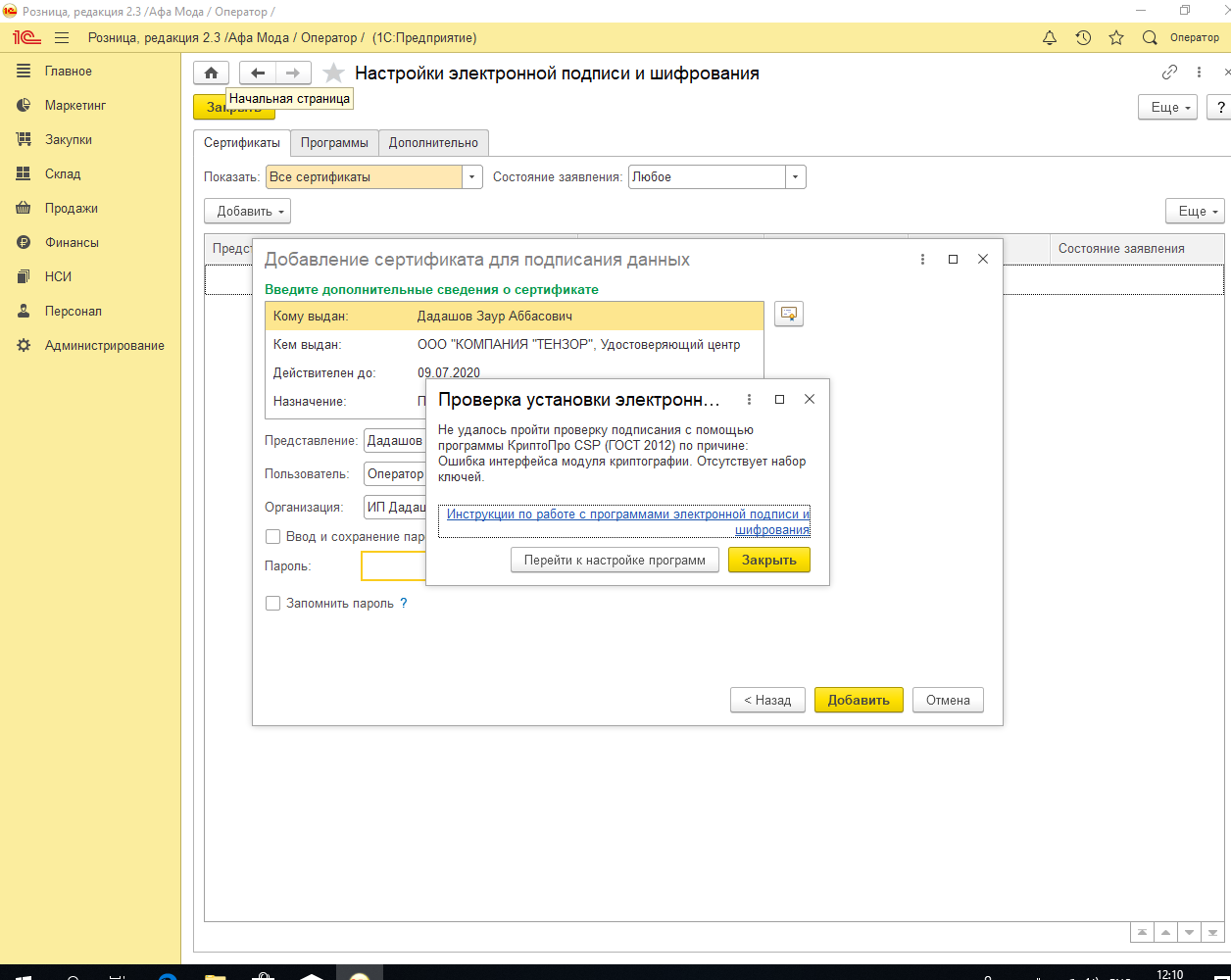 исправить ошибку криптографии 1с