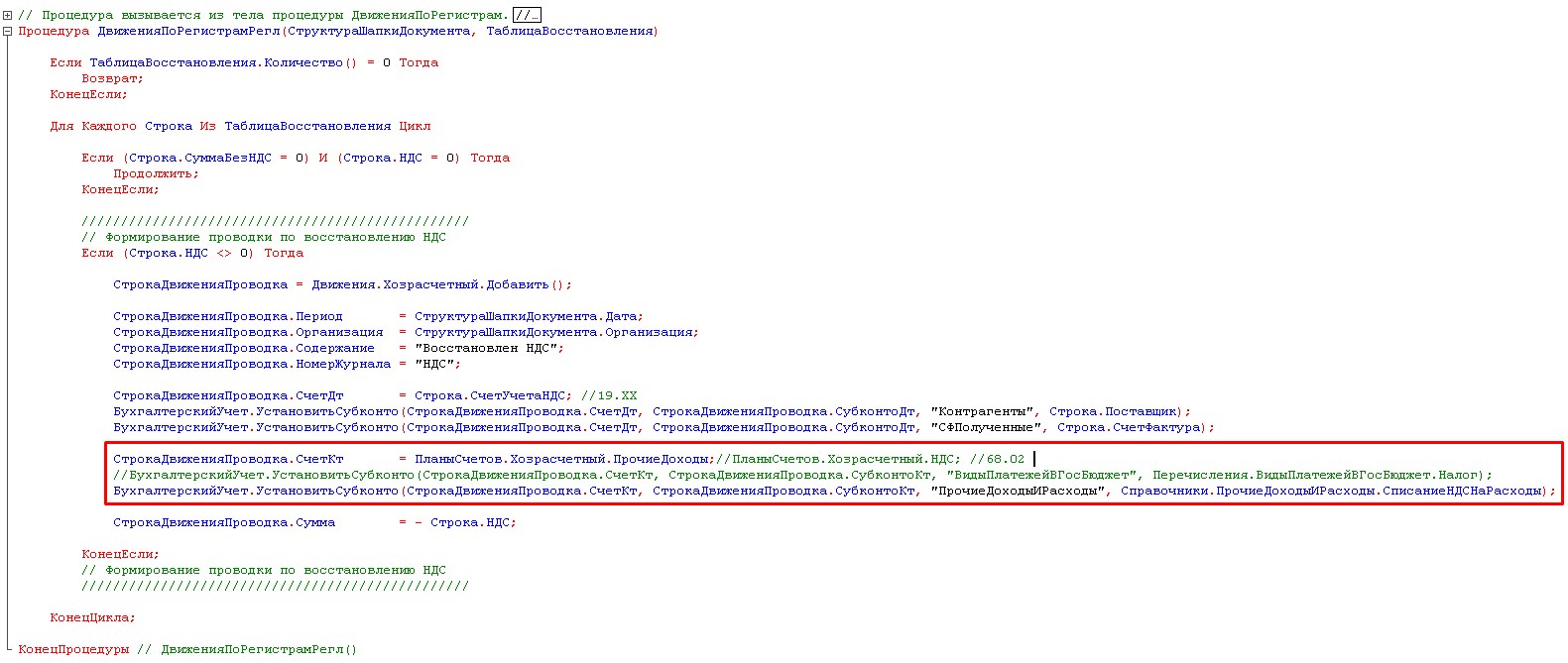 Дописать проведение документа Восстановление НДС в Бухгалтерии 3.0 (изменить один счёт на...