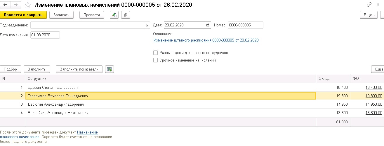 Если документ "изменение плановых начислений" делается на несколько сотрудников - то при нажатии на "печать" на каждого из них должна печататься это доп соглашение.