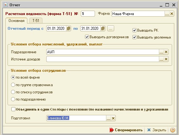 Тестовый Рабочий Камин 3.0 (dt-файл) и саму внешнюю ведомость Т-51 (файл ERF) вышлю только Исполнителю. Зуп 3.1 Проф и Корп могу тоже выслать dt-файлы (демки от 1С-ки). Из Камина 3.0: Основная форма отчёта (скрин - Буфер обмена02.jpg) и пример формирования и заполнения самой печатной формы т-51 (файл - т-51 за январь 2020.mxl), во вложениях в этом ТЗ (в 2-вух файлах). Для Зупа 3.1 (сначала Профа, потом уже для Корпа её адаптировать) ведомость т-51 можно сделать на СКД, либо не на СКД, это не принципиально уже, как будет для Вас проще и дешевле, так всё и делайте.