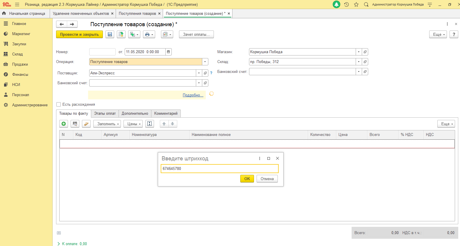 Во вкладке "поступлении товара (создание)" есть кнопка подбор по штрихкоду, но программа обязывает вводить ВЕСЬ штрихкод, только тогда она сможет найти нужный товар. В старой рознице 1.0 была возможность вручную найти товар по ЧАСТИ штрихкода. Даже если эта часть была одинаковая у нескольких товаров, то давалась возможность выбора нужного товара. В новой Рознице надо сделать так же. Собственно это все задание.