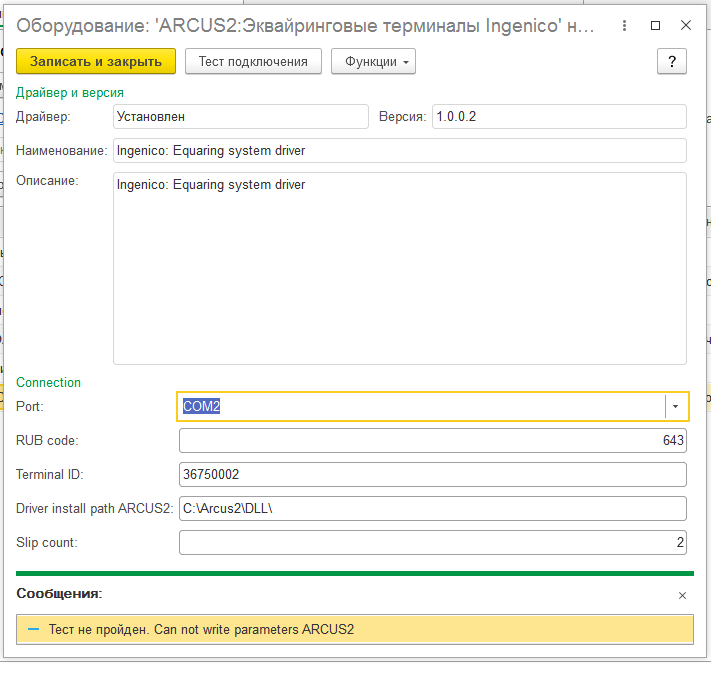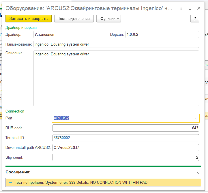 После чего 1С увидела драйвер терминала, но тест связи все равно не пройден. Дальше я ничего сделать не могу. Фото ошибки прикрепляю.