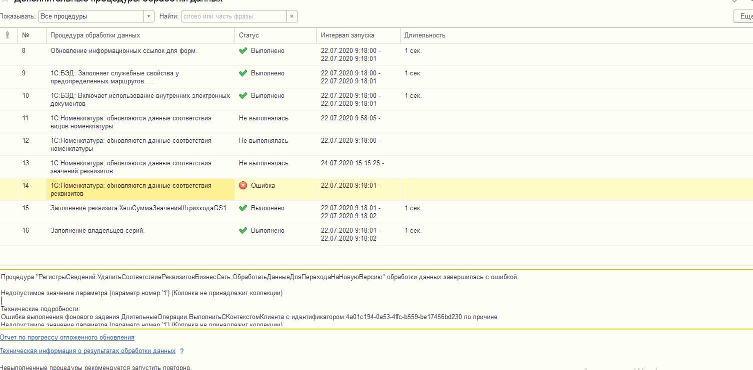{ОбщийМодуль.ОбновлениеИнформационнойБазыСлужебный.Модуль(3527)}: Если Не ЗавершитьПотокиВыполнившиеФЗ(ОписаниеПотоков, Параметры) Тогда