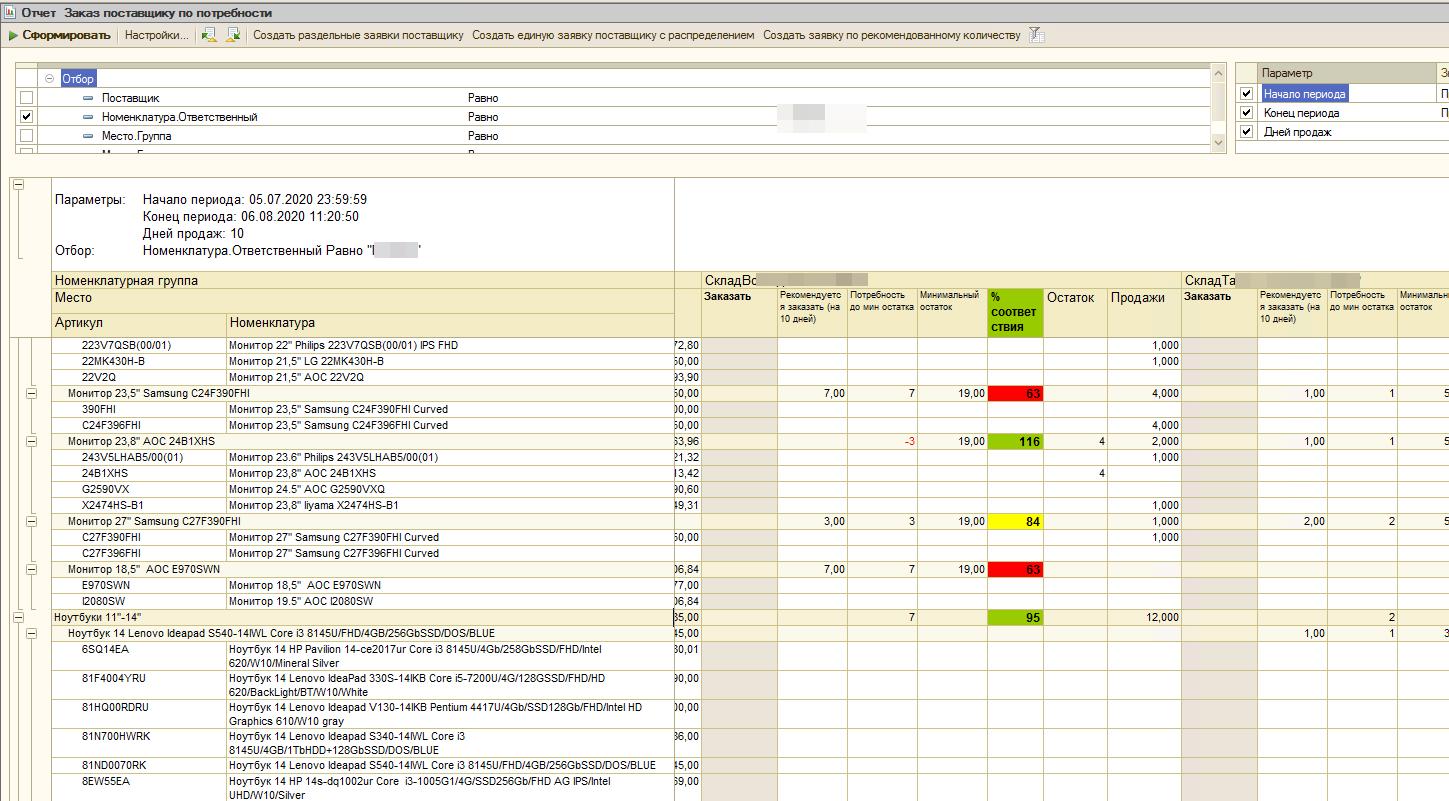 - анализ потребности по складам (оптовым) с учетом остатков склада, потребности, остатков и продаж магазинов. Коррекция финальной потребности прямо в отчете и формирование заявок поставщику.