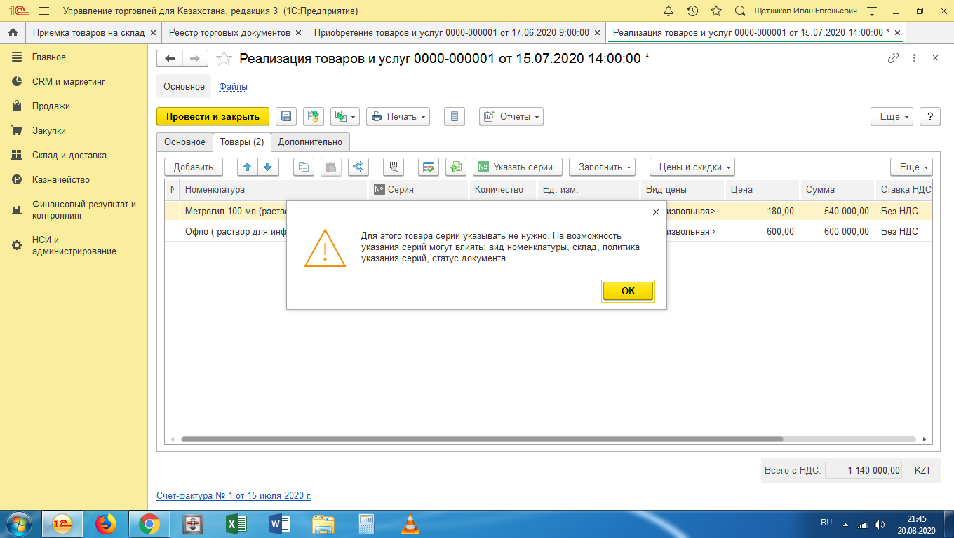 "Я не знаю в какой момент допущена ошибка, но серии в накладных у меня не проставляются. пишет что серии для этого товара указывать не нужно(картинка во вложении), а нам как раз указывать нужно.