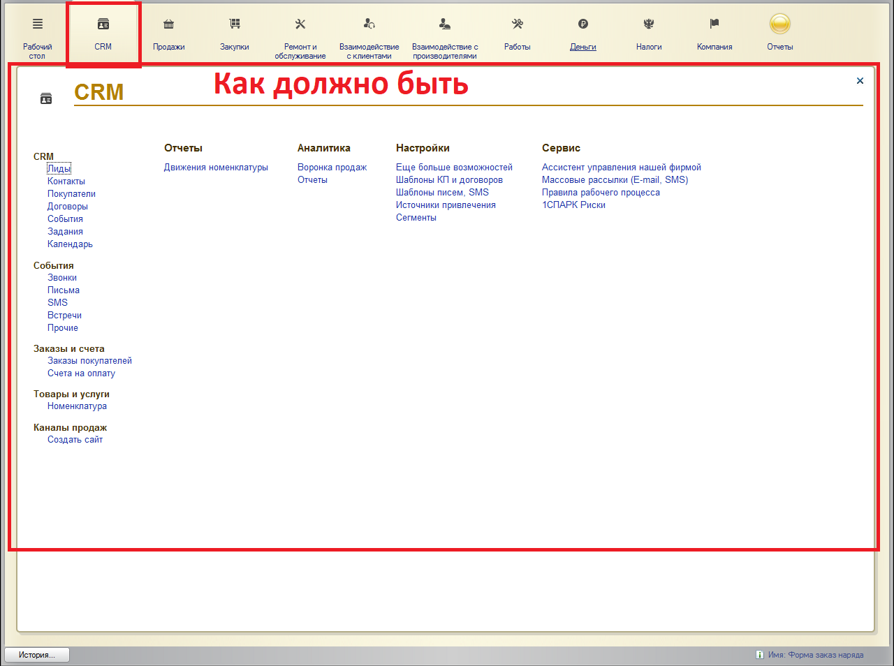 Все должно быть сделано через конфигуратор, не через настройку панелей в 1С предприятии.