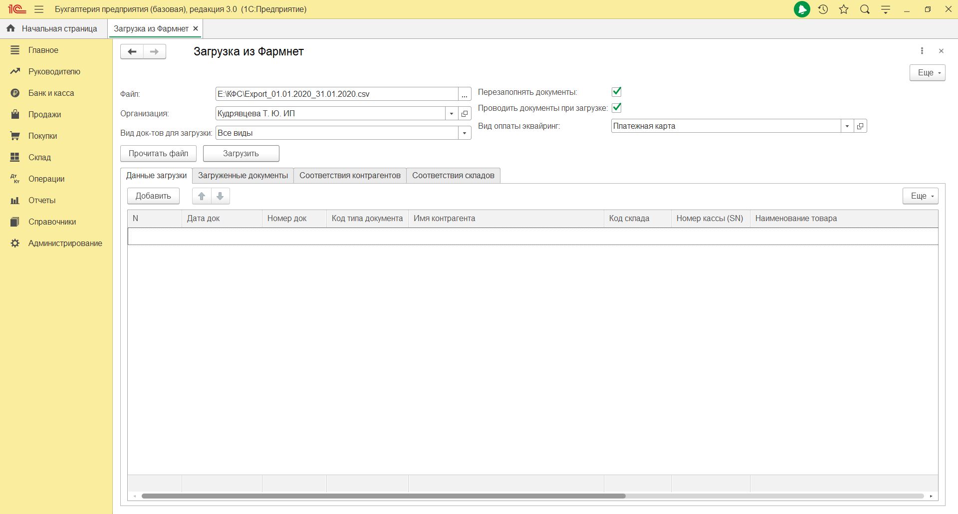 Из программы фармнет можно делать выгрузки отчетов. В 1с установлена программа для загрузки этих отчетов.