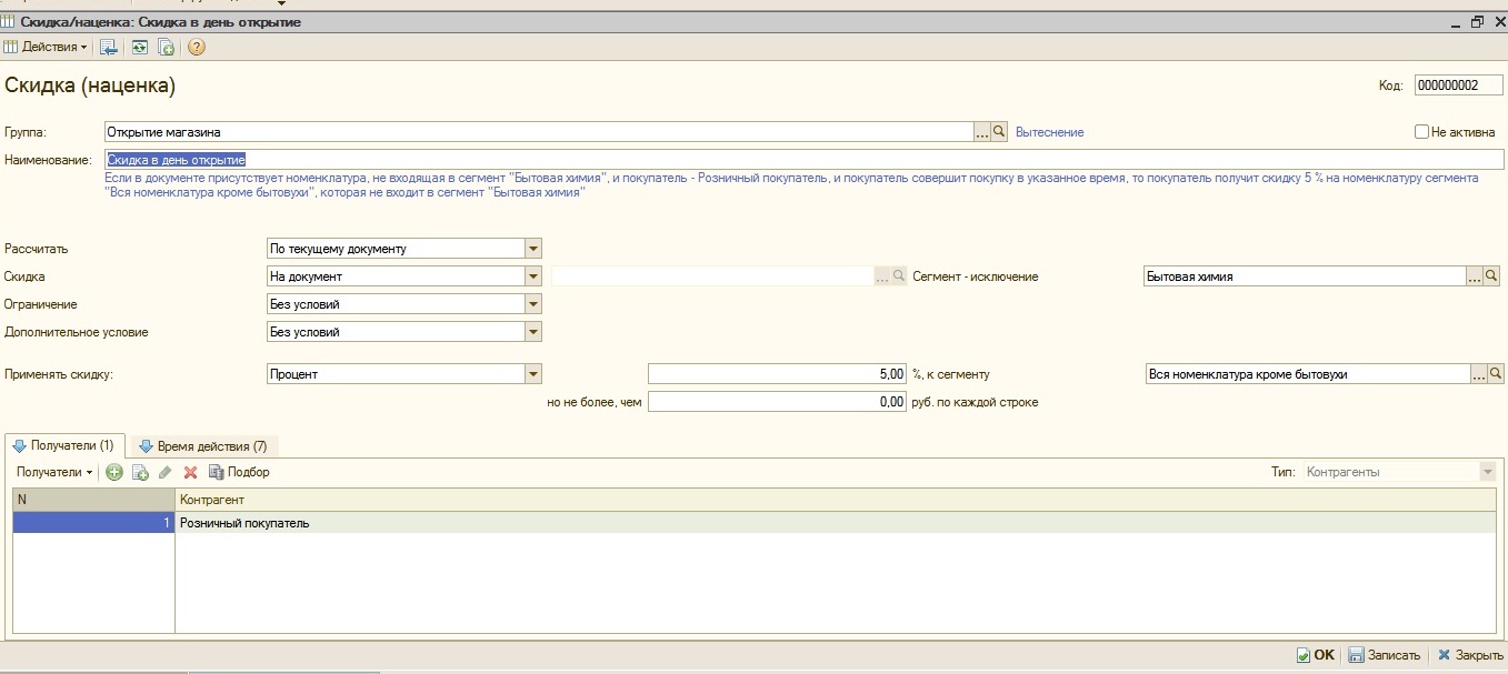 У нас Розница 1.0 (1.0.16.8) делаем скидку на открытие магазина (картинку прикладываю), но она почему то при регистрации продаж не расчиваеться.