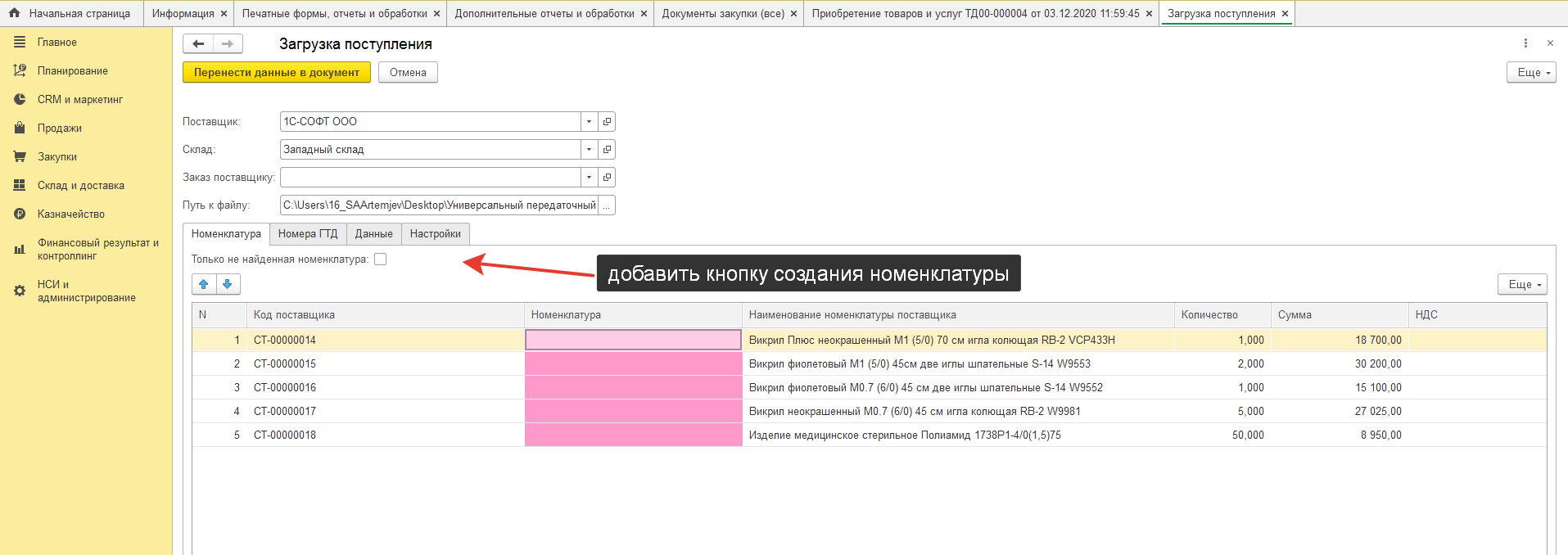 Также требуется добавить кнопку "создать номенклатуру", которая будет создавать неподобранную номенклатуру.