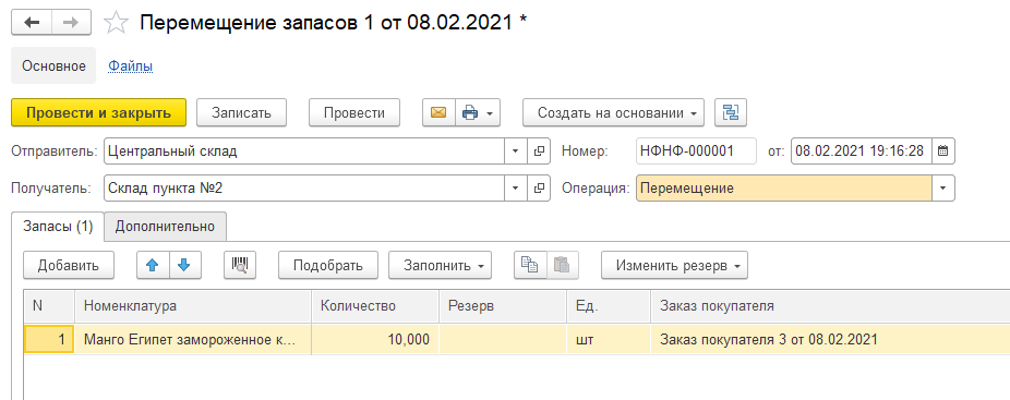 Формирование документа "перемещение запасов" в 1с УНФ