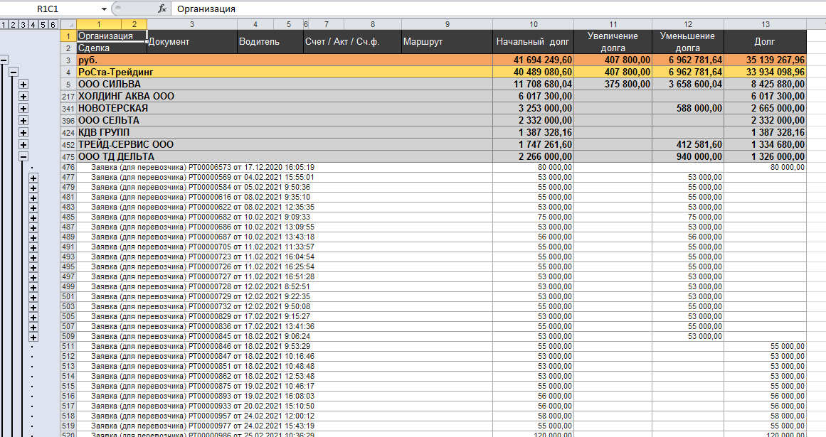 Думаю для знающих СКД делов минут на 40 , необходим отчет по продажам оплачено/неоплачено. Документ заявка самописный, на ее основании прогграммно создаётся счет , акт и сч.. Пример отчёта как должно выглядеть на скриншоте.