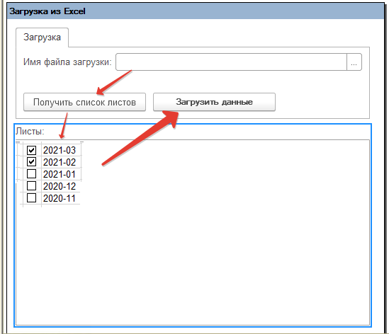 Загрузить из файла Excel список листов на форму (кнопка "Получить список листов").