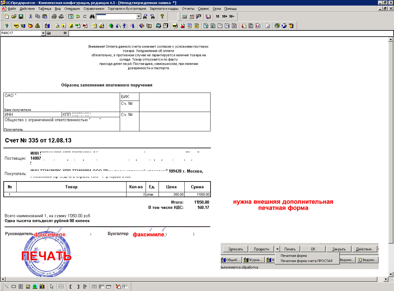 Нужна новая внешняя печатная форма счета покупателю с выводом на печать в цвете факсимиле и печати организации. 1с 7.7 комплексная. редакция 4.5.