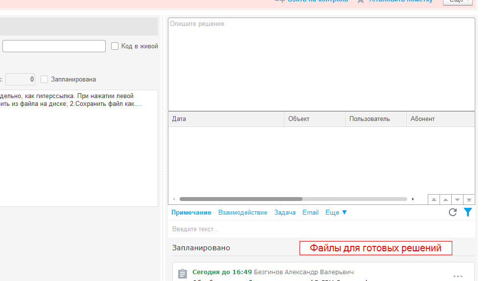 В CRM Создать функционал прикрепления файлов аналогично полю ТЭГ. Т.е, каждый файл будет выводиться отдельно, как гиперссылка. При нажатии левой клавишей мыши файл будет открываться, при нажатии правой вызываться контекстное меню с командами: 1.Обновить из файла на диске; 2.Сохранить файл как....