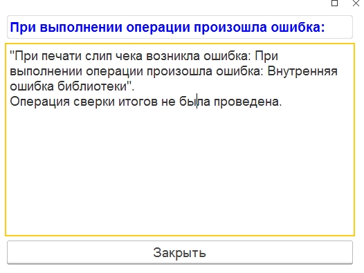 Здравствуйте. В какой-то момент начали замечать, что при закрытии смены в интерфейсе РМК перестала печататься сверка итогов с банковского терминала. Если запускать сверку итогов отдельно (не как часть закрытия смены), то все проходит нормально. Приложил скриншот ошибки. Для работы над проблемой есть возможность подключения на торговую точку после 21.00 по московскому времени (AnyDesk, TeamViewer).