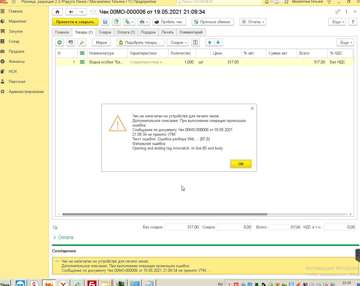 При закрытии чека, выдает ошибку - см. принтскрин в приложении
