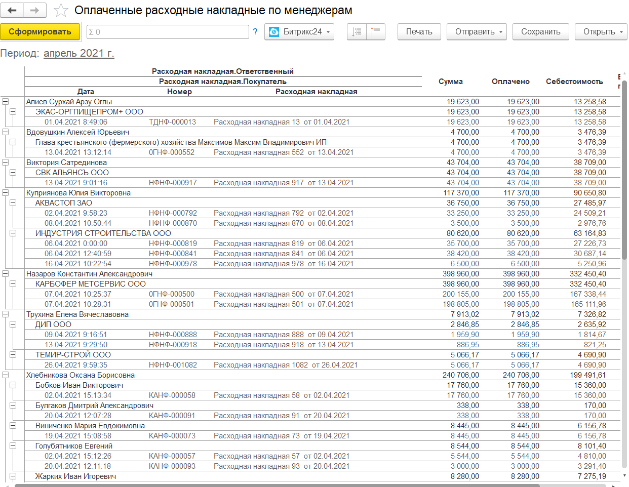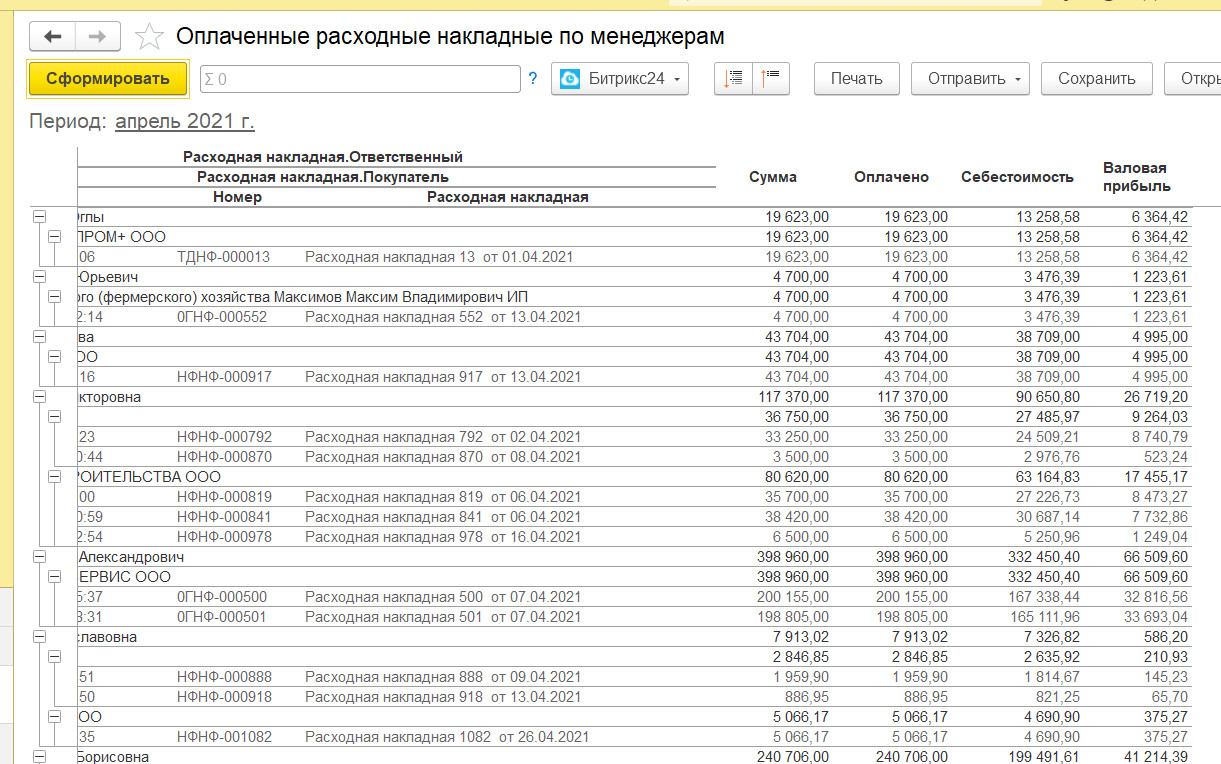 Горизонтальные поля и группировки - организация, менеджер, контрагент кому продали, расходная накладная.